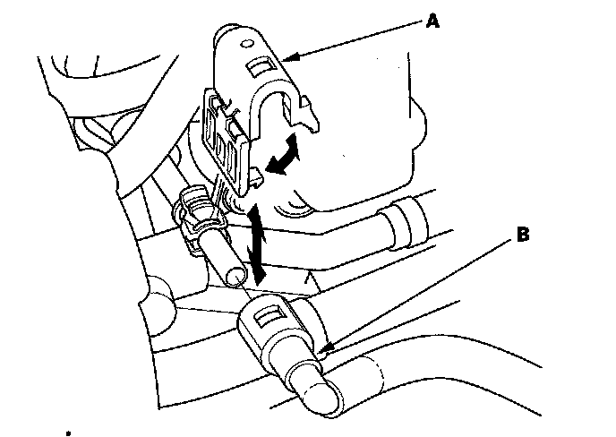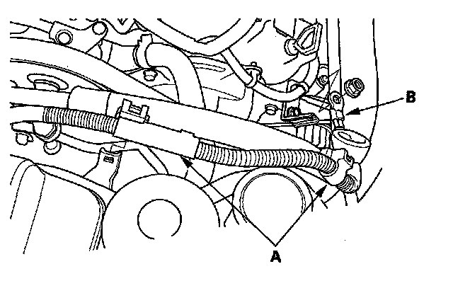 15. Remove the brake booster vacuum hose (A) and evaporative emission (EVAP) canister hose (B).
