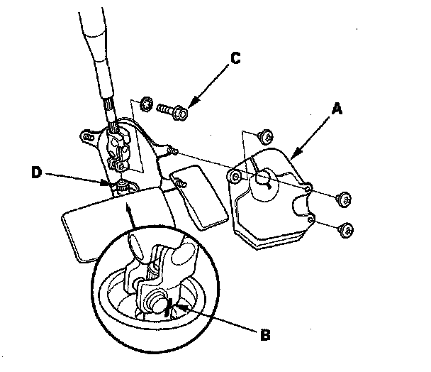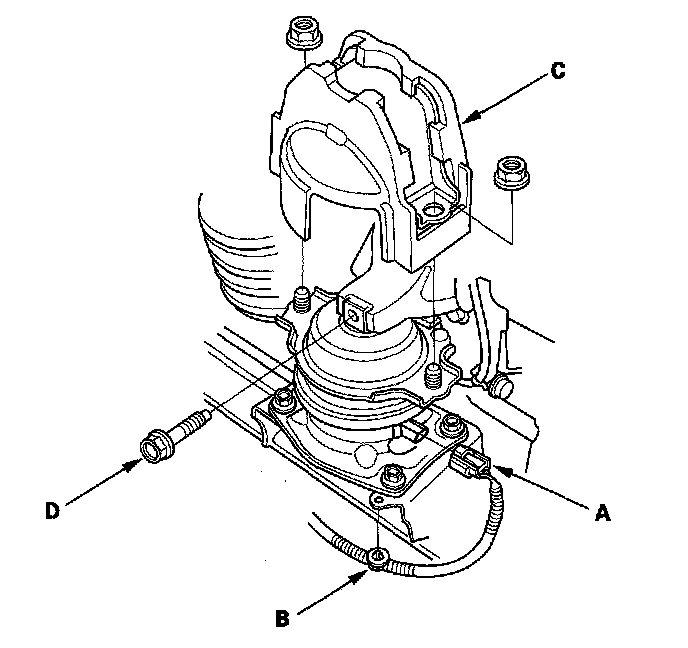 57. J35A7 engine: Disconnect the front active control engine mount (ACM) actuator connector (A) and harness clamp (B), remove front engine mount stop (C), then remove the front engine mount bolt (D).