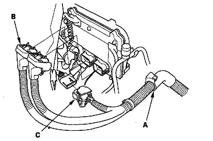 11. Remove the harness clamps (A), the intake air duct cover (B), and the bolt (C) holding the intake air duct.