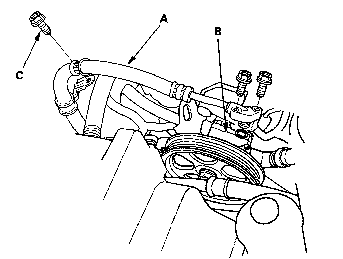 25. Remove the power steering pump outlet hose (A) at the pump (B) and remove the hose clamp bolt (C).