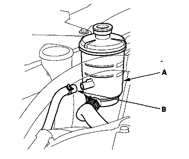 26. Remove the power steering fluid reservoir (A) from its holder and disconnect the return hose (B).