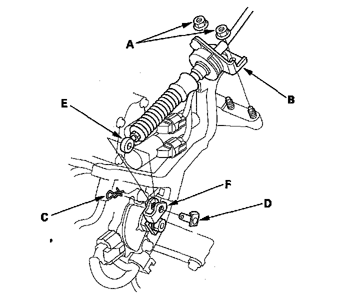 29. Remove the snap pin (C) and the control pin (D), then separate the shift cable end (E) from the control lever (F). Do not bend the shift cable excessively.