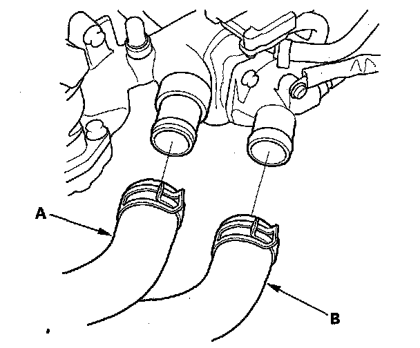 47. Remove the upper radiator hose (A) and lower radiator hose (B).