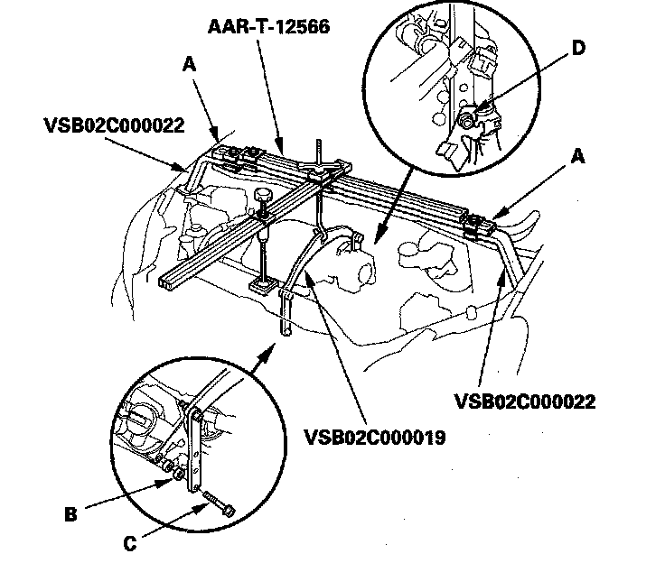 54. Install the engine hanger adapters (VSB02C000022) on the end of the engine support beams (A), then install the engine support hanger (AAR-T-12566) with the adapters to the vehicle.