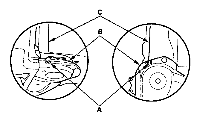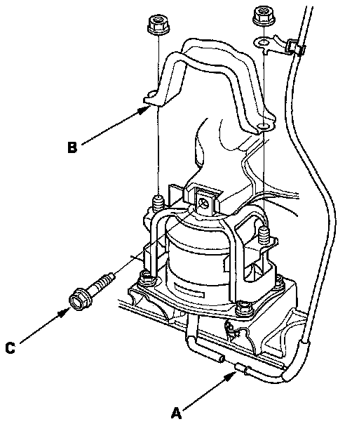 56. J35A6 engine: Remove the front engine mount control solenoid valve tube (A) and front engine mount stop (B), then remove the front engine mount bolt (C).