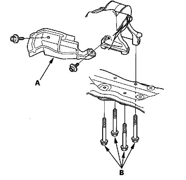 59. J35A6 engine: Remove the heat shield (A) and the rear engine mount bolts (B).