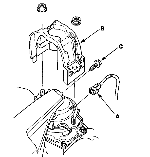 60. J35A7 engine: Disconnect the rear ACM actuator connector (A), remove rear engine mount stop (B), then remove the rear engine mount bolt (C).