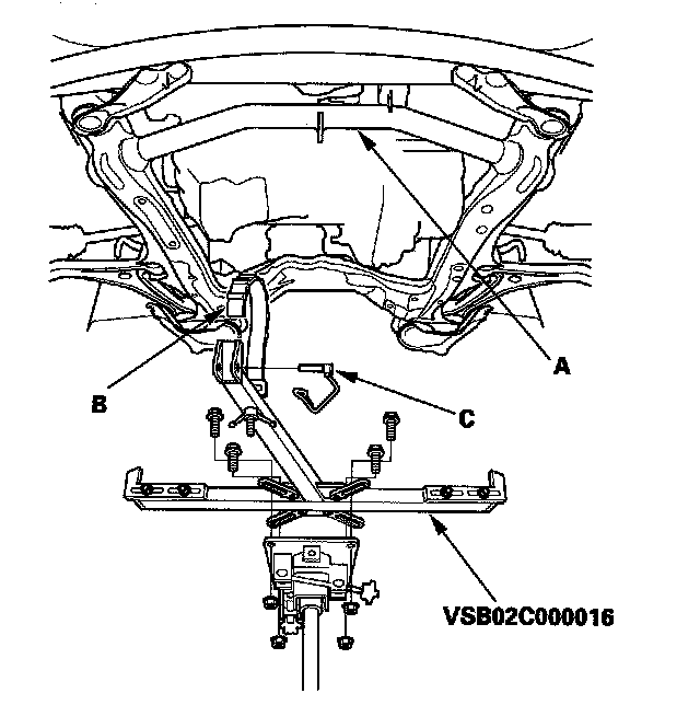 62. Attach the front subframe adapter (VSB02C000016) to the subframe (A) by hanging the belt (B) over the front of the subframe, then secure the belt with its retaining pin (C).