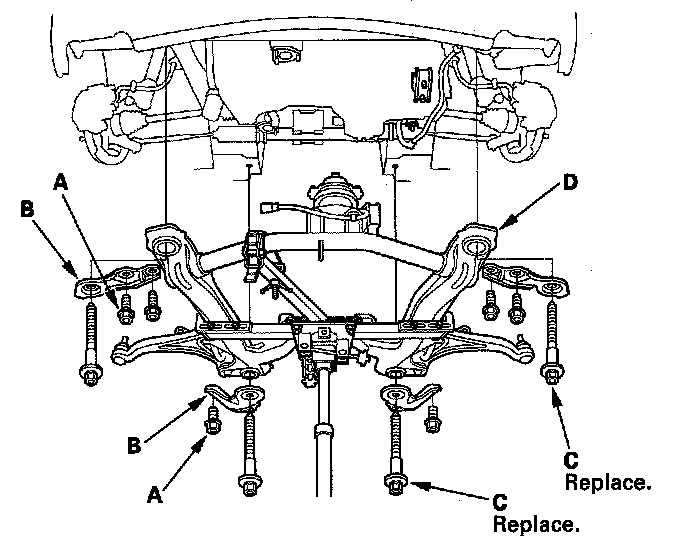 64. Remove the six 12 x 1.25 mm bolts (A) securing the subframe stiffeners (B), the four subframe mounting bolts (C), and the stiffeners, then lower the front subframe (D).