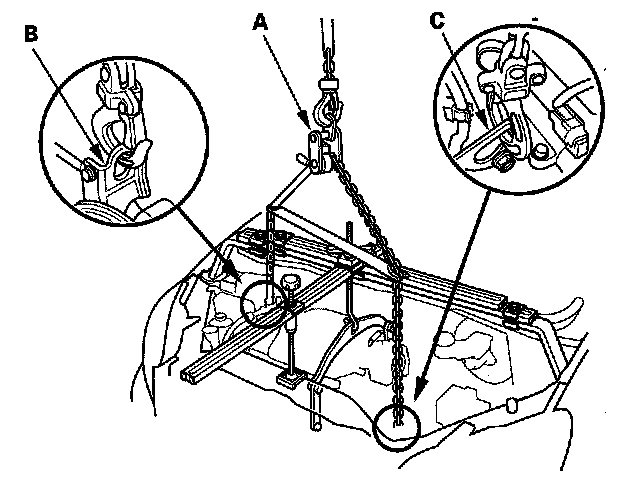 66. Attach a chain hoist (A) to the engine hook (B) and the transmission hook (C), then lift up the engine/transmission until it is securely supported by the chain hoist, and remove the engine support hanger and engine hanger adapters.