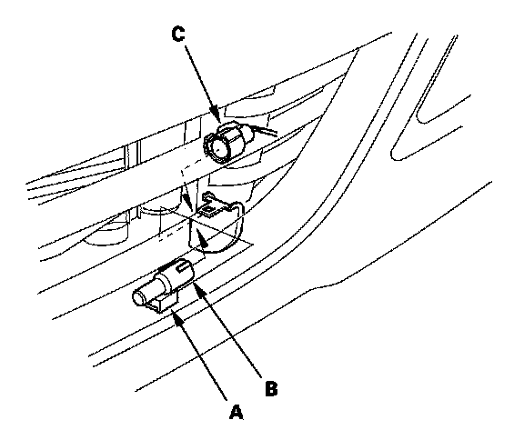 Outside Air Temperature Sensor Replacement1. Lift the tab (A) to release the lock, then remove the outside air temperature sensor (B) from the back of the front bumper beam. Disconnect the 2P connector (C) from the outside air temperature sensor.