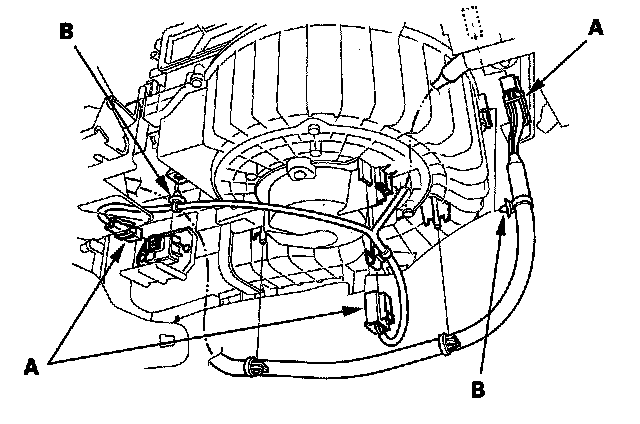 2. Disconnect the connectors (A) from the climate control unit (with climate control), the blower motor, and the power transistor, then remove the wire harness clips (B).