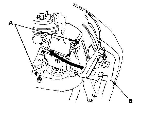 4. Remove the splash shield. Remove the clips (A) and bolt from the right front inner fender (B). Then move the right front inner fender to the rear.