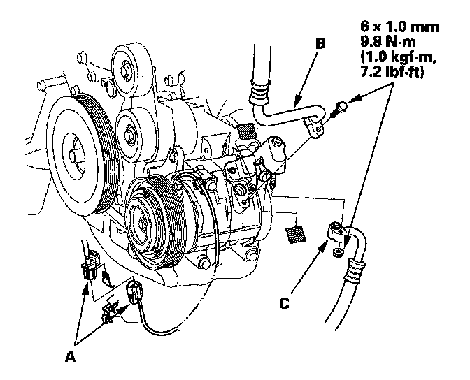 5. Disconnect the A/C compressor clutch connector (A). Remove the bolt and the nut, then disconnect the suction line (B) and discharge line (C) from the A/C compressor. Plug or cap the lines immediately after disconnecting them to avoid moisture and dust contamination.