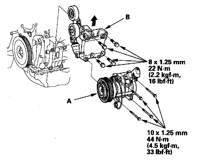 8. Install the A/C compressor in the reverse order of removal, and note these items:
