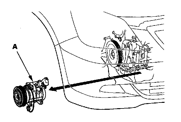 6. Remove the mounting bolts, then detach the A/C compressor (A). Remove the mounting bolts, then slide up the A/C compressor bracket (B).