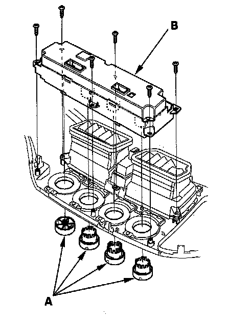 2. Remove the dials (A), the self-tapping screws, and the A/C control panel (B).