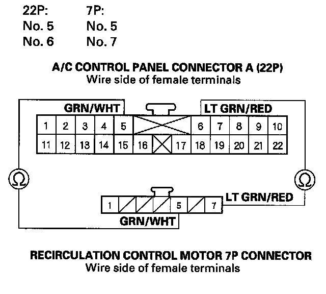 11. Check for continuity between the above terminals of A/C control panel connector A (22P) and the recirculation control motor 7P connector.