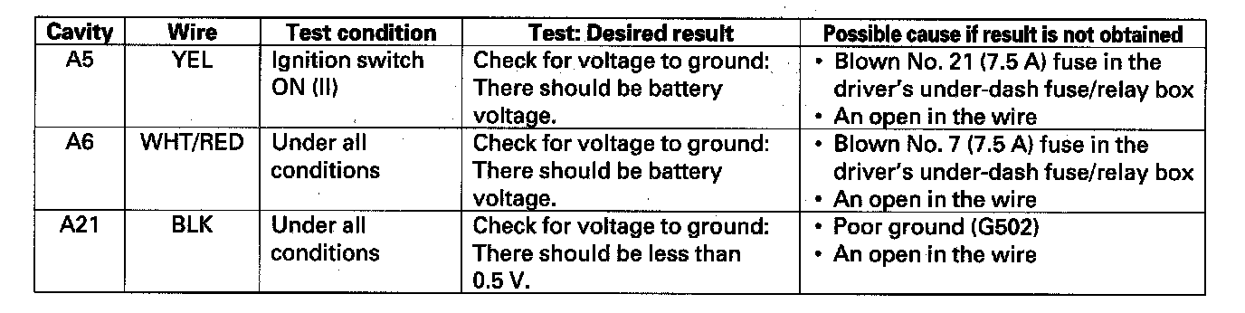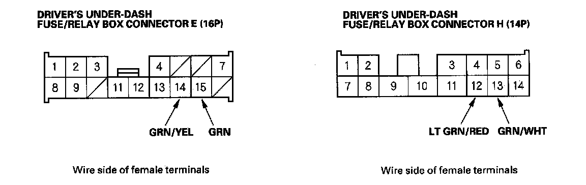5. Reconnect the connectors to the driver's under-dash fuse/relay box. Turn the ignition switch ON (II) and make these input tests at the appropriate connectors on the driver's under-dash fuse/relay box.