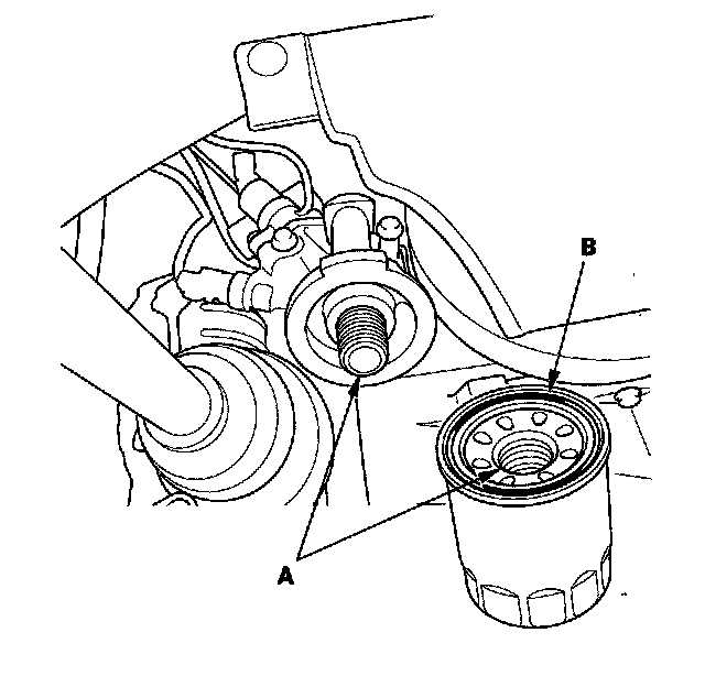 3. Inspect the threads (A) and rubber seal (B) on the new filter. Clean the seat on the engine block, then apply a light coat of new engine oil to the filter rubber seal. Use only filters with a built-in bypass system.