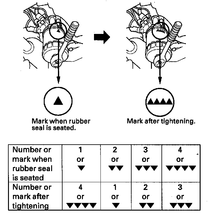 ^ Spin the filter on until its seal lightly seats against the block, and note which number or mark is at the bottom.