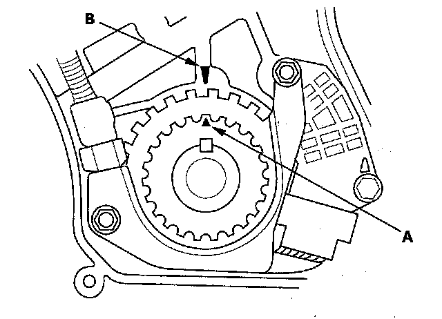 3. Set the timing belt drive pulley to top dead center (TDC) by aligning the TDC mark (A) on the tooth of the timing belt drive pulley with the pointer (B) on the oil pump.