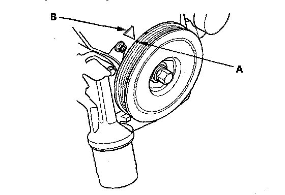 22. Turn the crankshaft pulley so its white mark (A) lines up with the pointer (B).