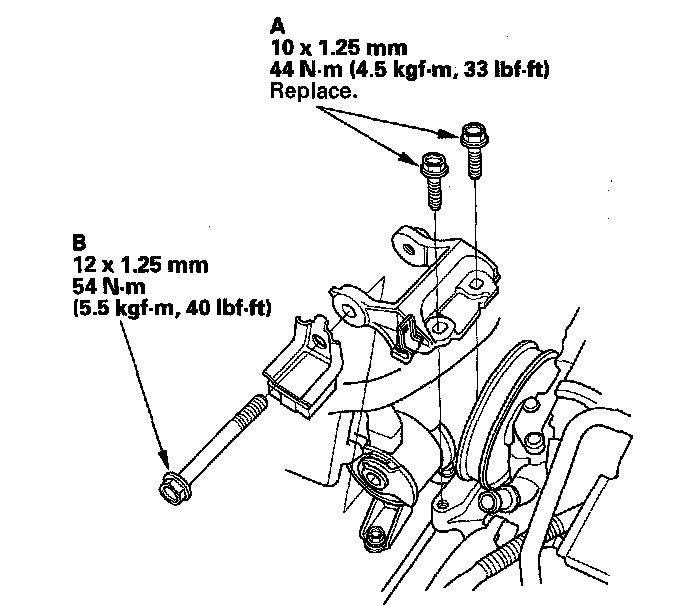 24. Install the upper half of the side engine mount bracket, and tighten the new mounting bolts (A), then the mass damper mounting bolt (B).