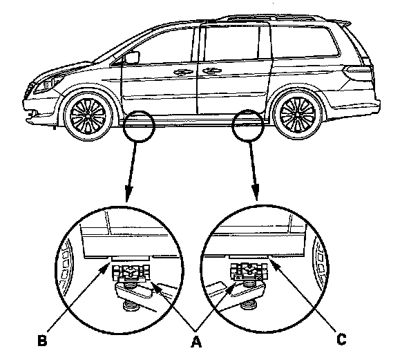 1. Position the lift blocks (A) under the vehicle's front support points (B) and rear support points (C).