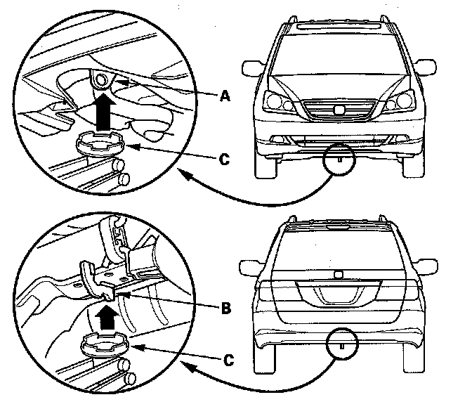 3. Position the floor jack under the front jacking bracket (A) or the rear jacking bracket (B). Center the jacking bracket on the jack lift platform (C), and jack up the vehicle high enough to fit the safety stands under it.