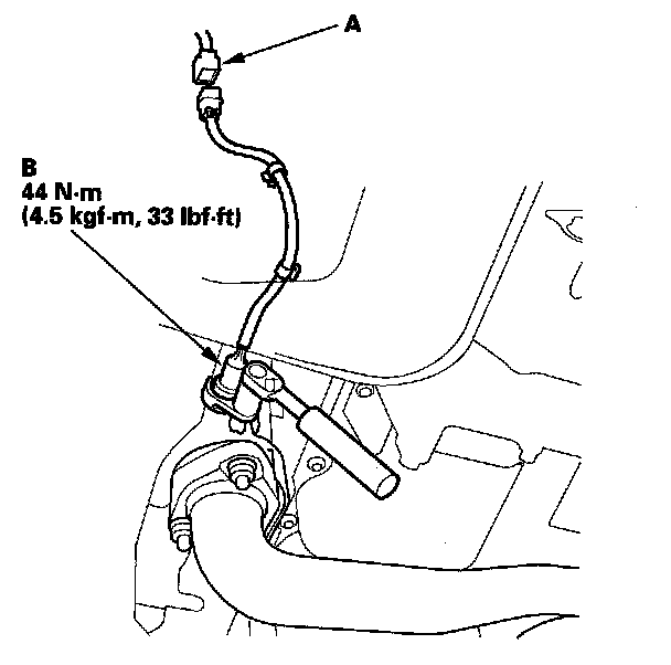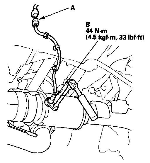 1. Disconnect the front secondary HO2S 4P connector (A), then remove the front secondary HO2S (B).