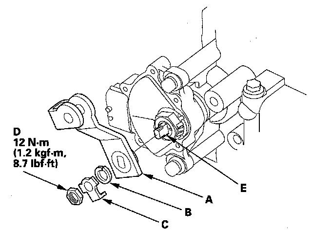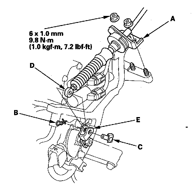 7. Remove the spring clip (B) and the control pin (C), then separate the shift cable end (D) from the control lever (E).