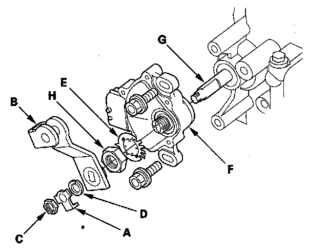 10. Pry the lock tabs of the lock washer (E) on the transmission range switch (F), hold the selector control shaft (G) with a 6.0 mm wrench, and loosen the locknut (H).