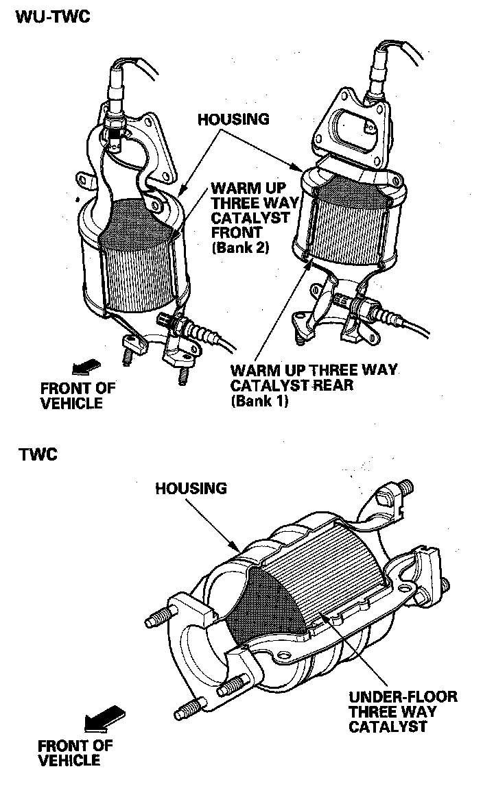 The WU-TWC/TWC converts hydrocarbons (HC), carbon monoxide (CO), and oxides of nitrogen (NOx) in the exhaust gas to carbon dioxide (CO2), nitrogen (N2), and water vapor.