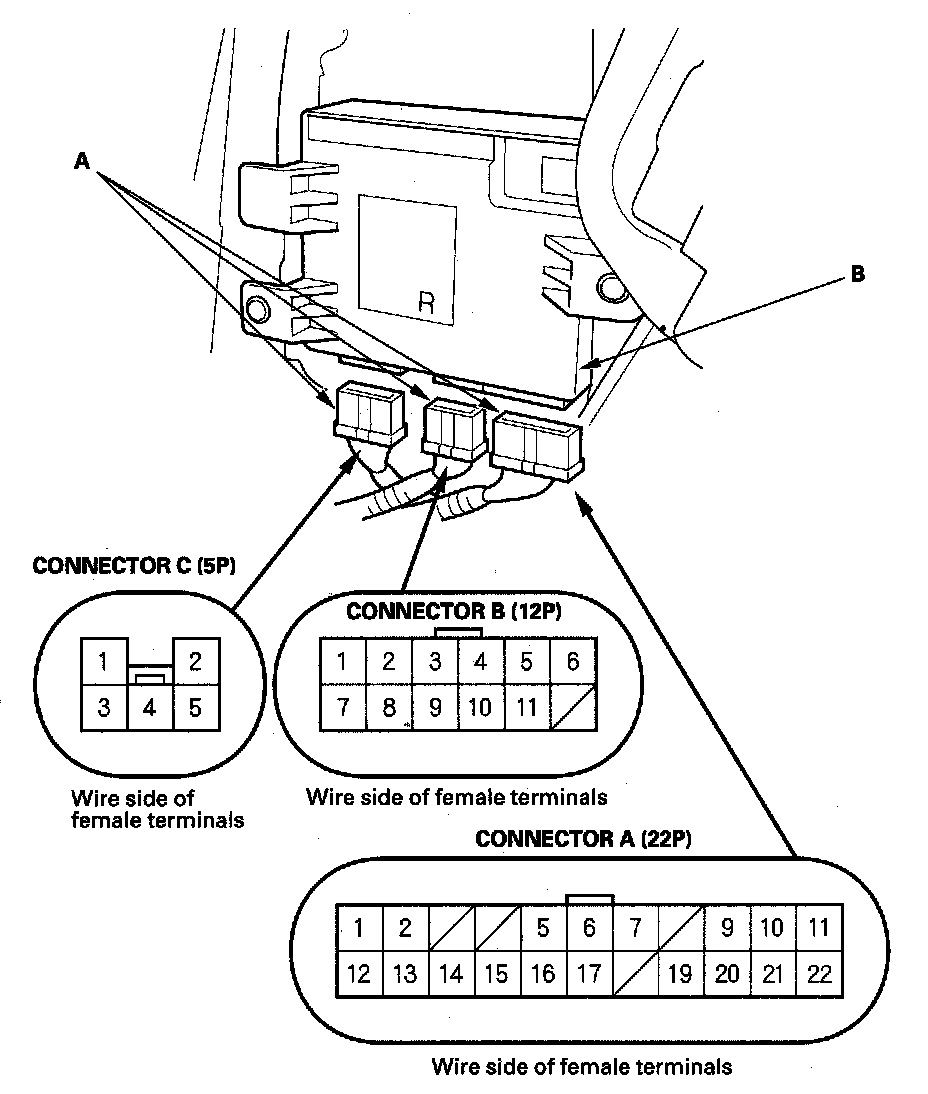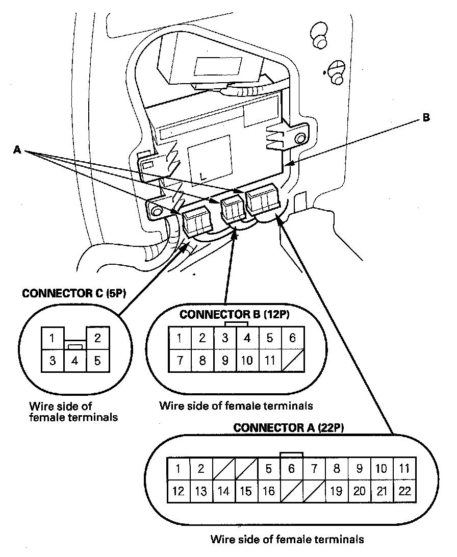 3. Disconnect the 22P, 12P, and 5P connectors (A) from the right power sliding door control unit (B).