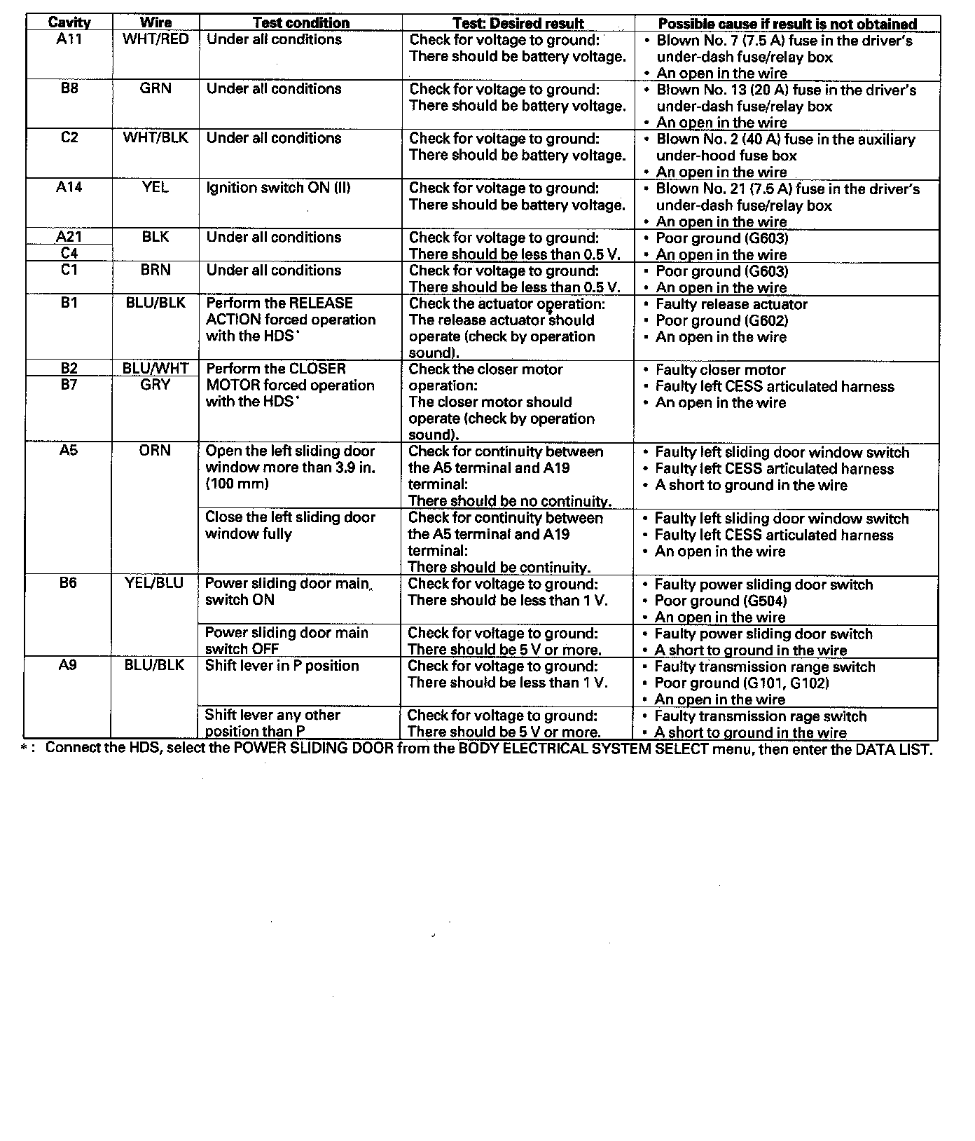 5. Reconnect all connectors to the left power sliding door control unit, and make these input tests at the appropriate connector.