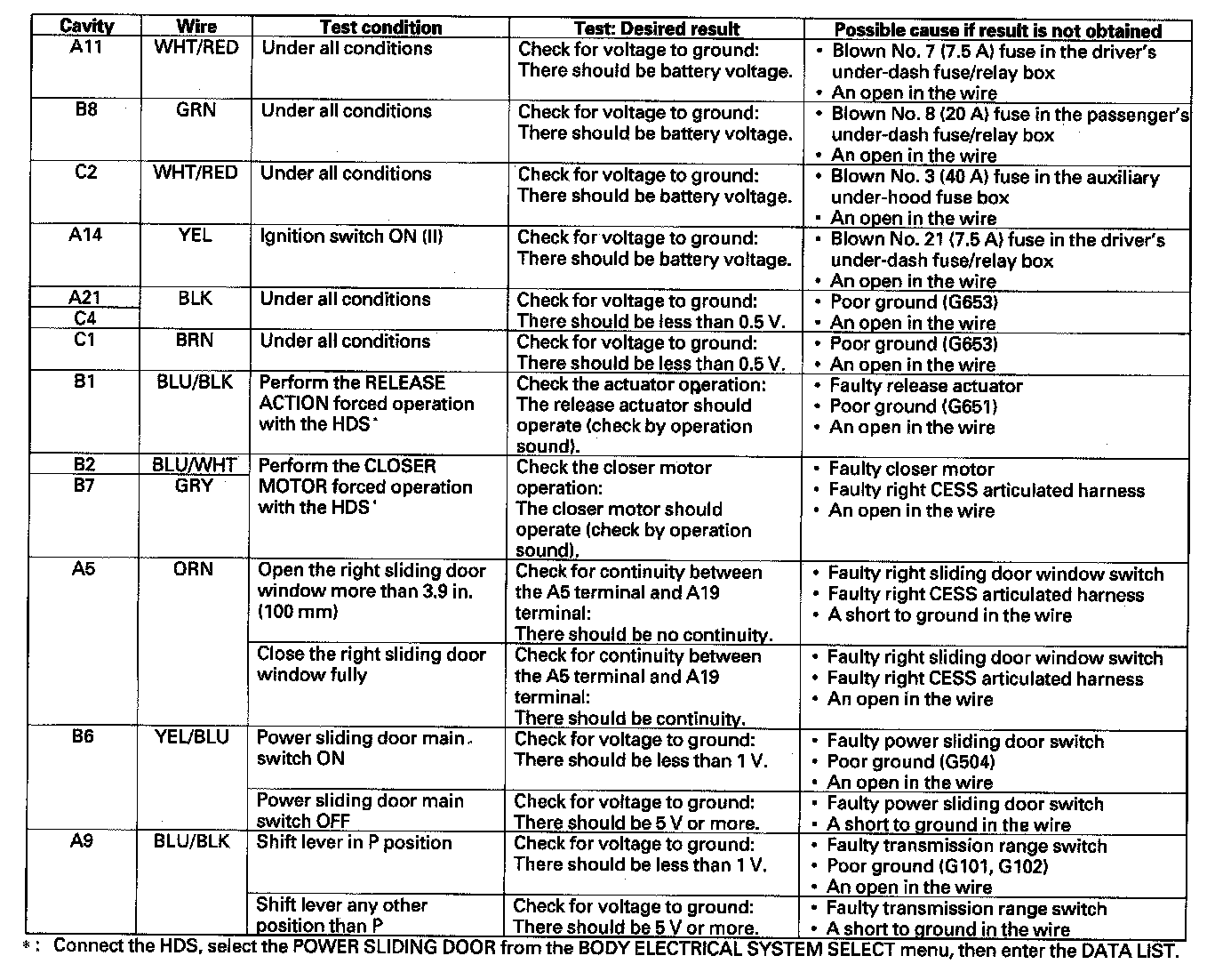 5. Reconnect all connectors to the right power sliding door control unit, and make these input tests at the appropriate connector.
