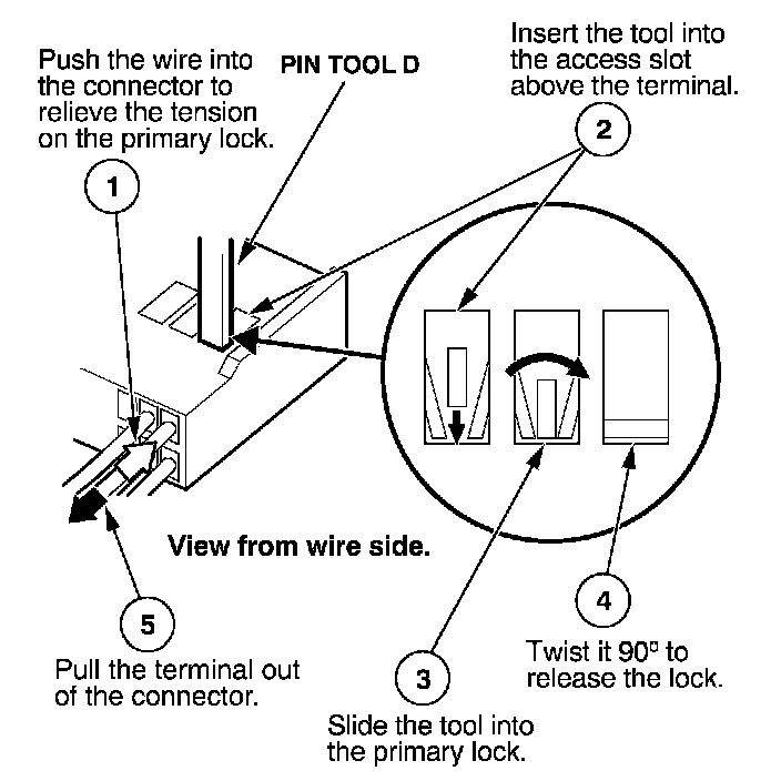 Before you begin, inspect the wire you are about to repair for damage and length. Make sure the wire will be long enough to make a terminal repair without stretching it when you reinstall the terminal in the connector. If the wire is too short, or if access to the connector is too restricted to make a terminal repair, you may need to install a pigtail terminal (a short length of wire with a factory-crimped terminal on it). Refer to HOW TO INSTALL PIGTAIL TERMINALS.