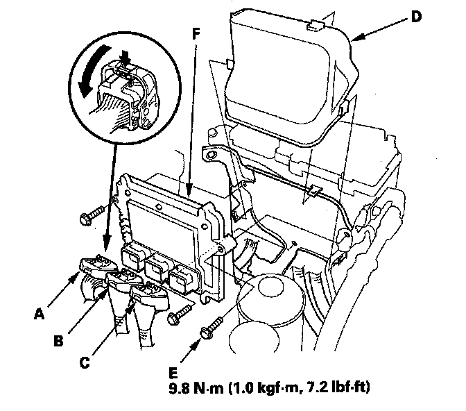NOTE: PCM connectors A, B, and C have symbols (A=[], B=/\, C=O) embossed on them for identification.