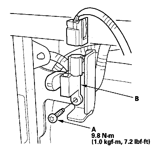 1. Install the new driver's seat position sensor with a TORX bolt (A), then connect the floor wire harness or seat position sensor harness 2P connector to the driver's seat position sensor (B).