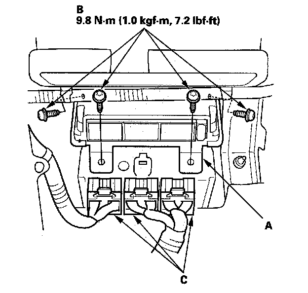 1. Install the new SRS unit (A) with TORX bolts (B), then connect the connectors (C) to the SRS unit; push them into position until they click.