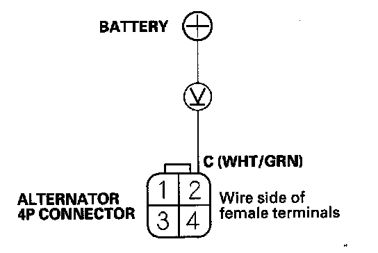 5. Measure the voltage between alternator 4P connector terminal No. 2 and the positive terminal of the battery.