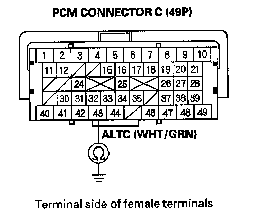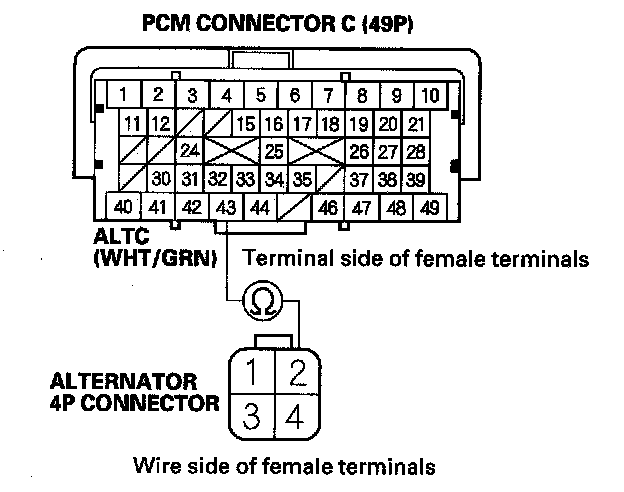 10. Disconnect PCM connector C (49P) and the alternator 4P connector.