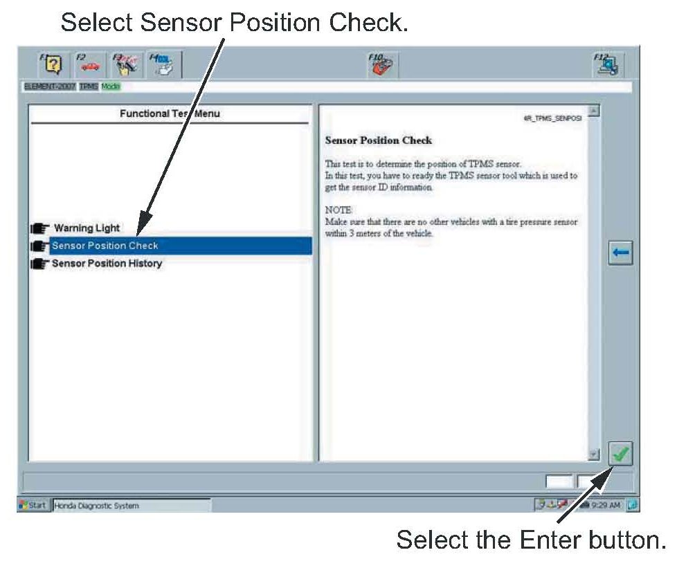 11. Follow the instructions on the Sensor Position Check screen. When prompted, go to the left front wheel, then select the Enter button.