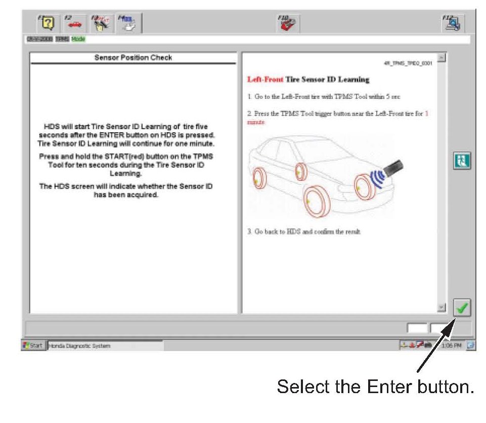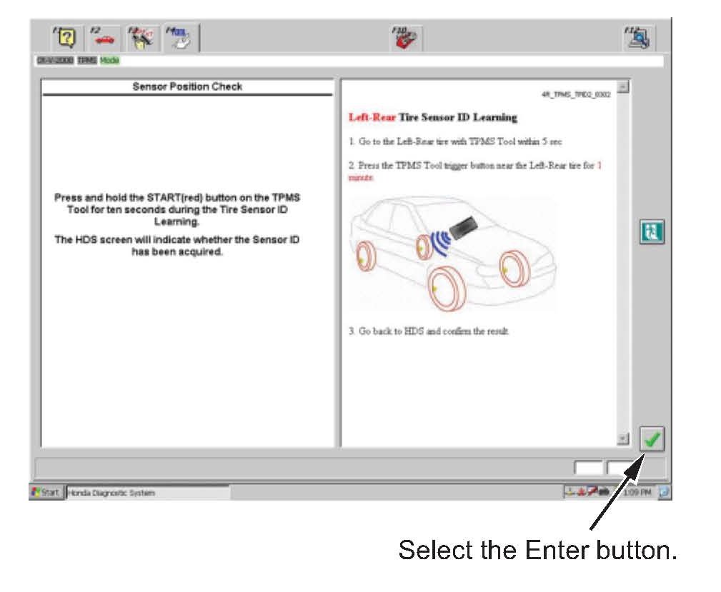 11. Follow the instructions on the TPMS Sensor ID Learning screen. When prompted, go to the left front wheel, then select the Enter button.