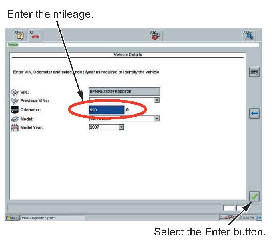5. The VIN information appears automatically, but you must enter the mileage, and select the Enter button.