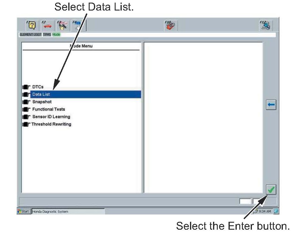 25. In the Mode Menu, select the Data List, and then select the Enter button. Check the tire pressure at all four tires to confirm that the TPMS control unit is reading the correct tire pressures.