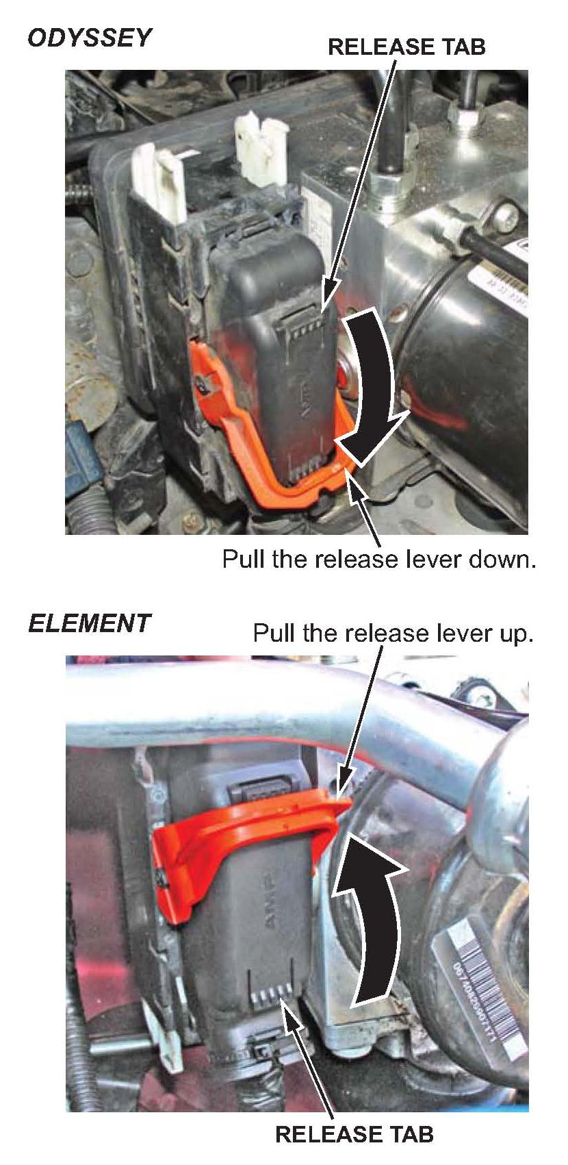 8. Disconnect the VSA modulator-control unit 47P connector by pressing the release tab, and then pulling down (Odyssey) or up (Element) on the orange release lever; the connector then disconnects itself.