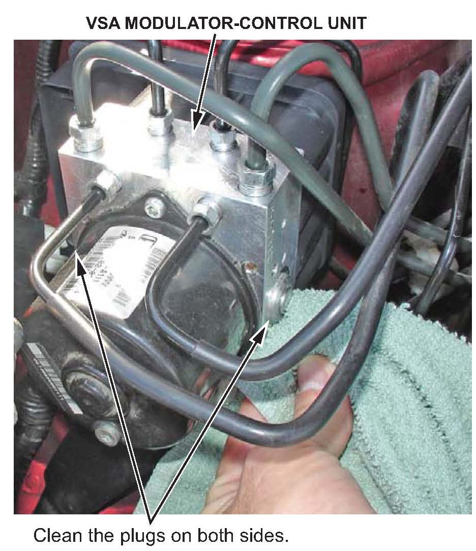 Bleed the brake system using the special procedure in this service bulletin, then install two modulator sealing caps over the two plugs on the sides of the VSA modulator-control unit.