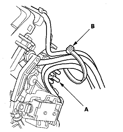 7. Route the harnesses along the harness guide (A), and tie the harnesses and guide with the new band (B).